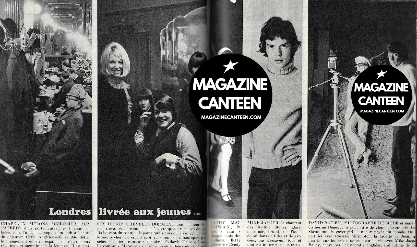 2 pages on the London scene includes 1 image of Mick Jagger, plus on on set shoot image of David Bailey and Chrissie Shrimpton