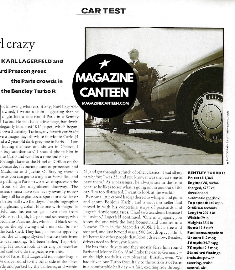 Car test - A one-page driving feature with Karl Lagerfeld - includes a quarter pae image of Karl photographed by Matthew Donaldson