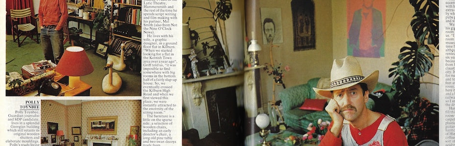 Celebrity lairs - 3 pages at home with celebrities. Includes a full page image of Hank Wangford. A third of a page with Griff Rhys Jones. Half a page with Captain Sensible. Images by Trevor Leighton