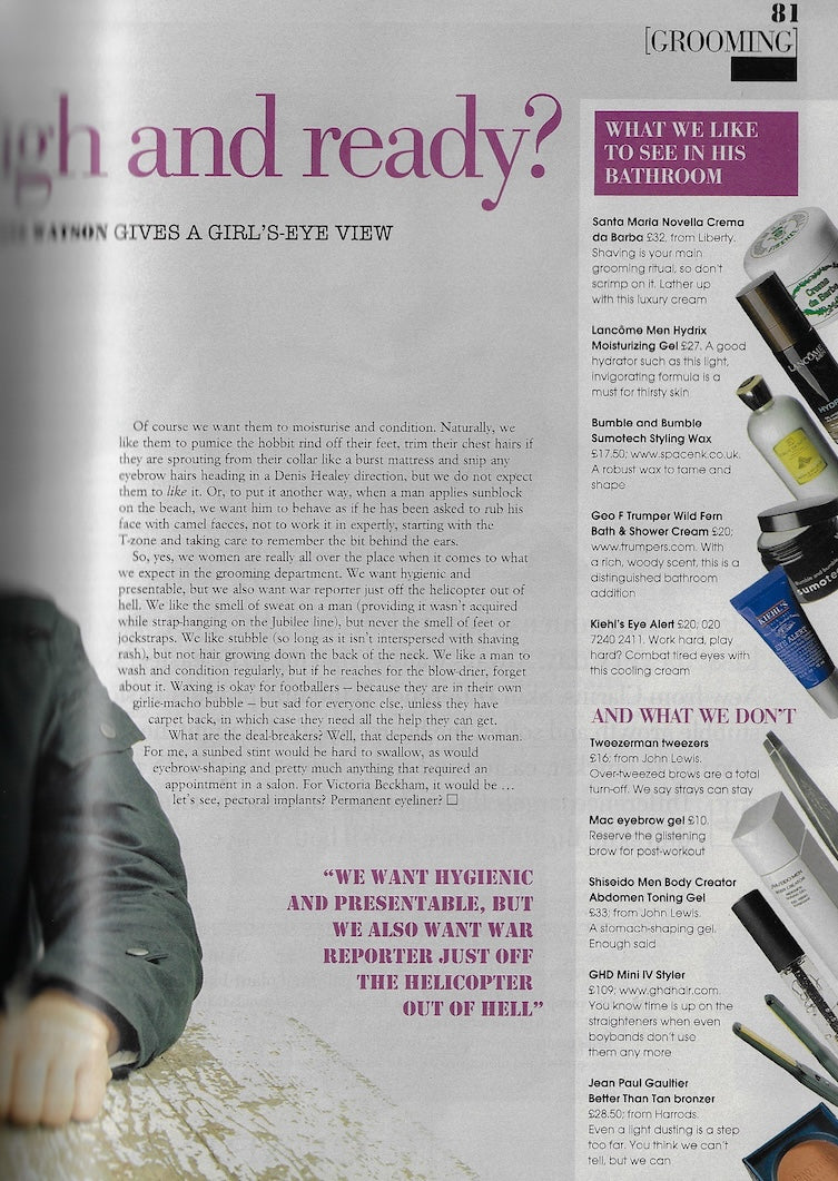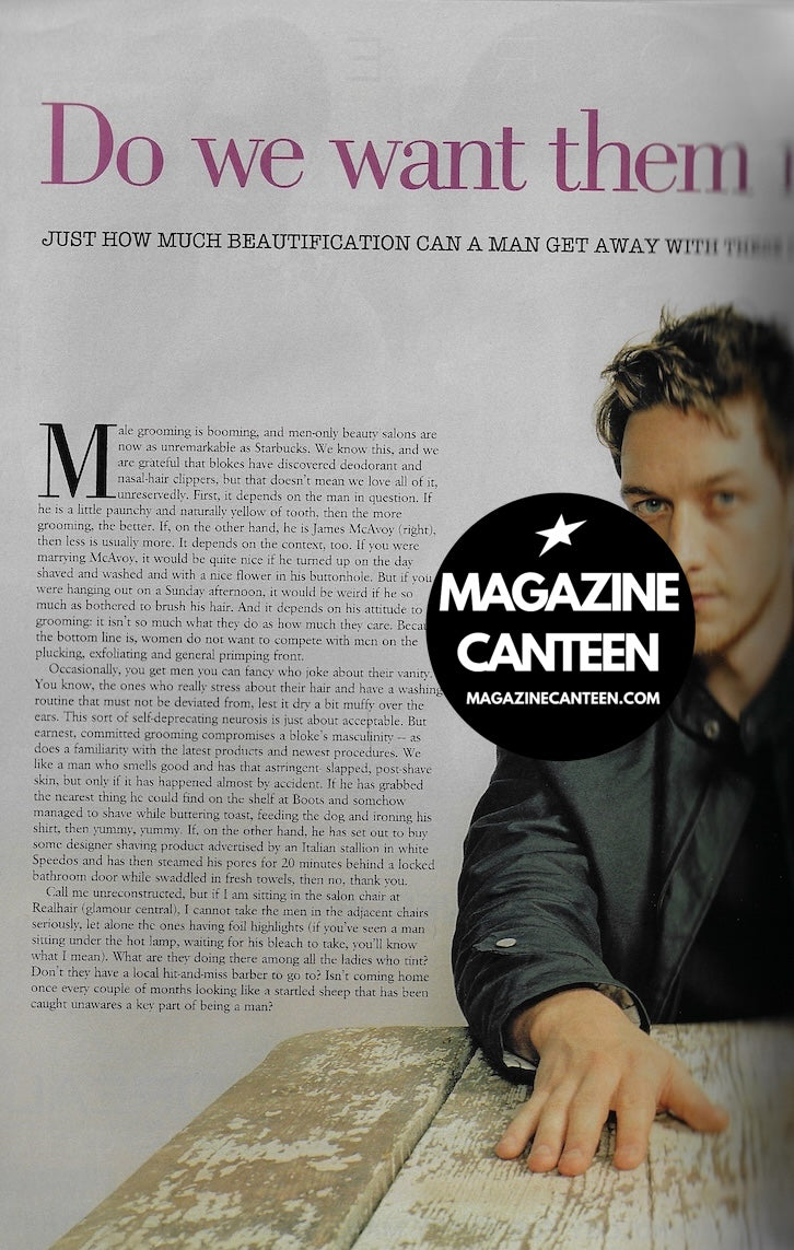 A feature on male grooming includes an image of James McAvoy at a rough table. There is no photographer credited or no real explanation of why the image of James is used!