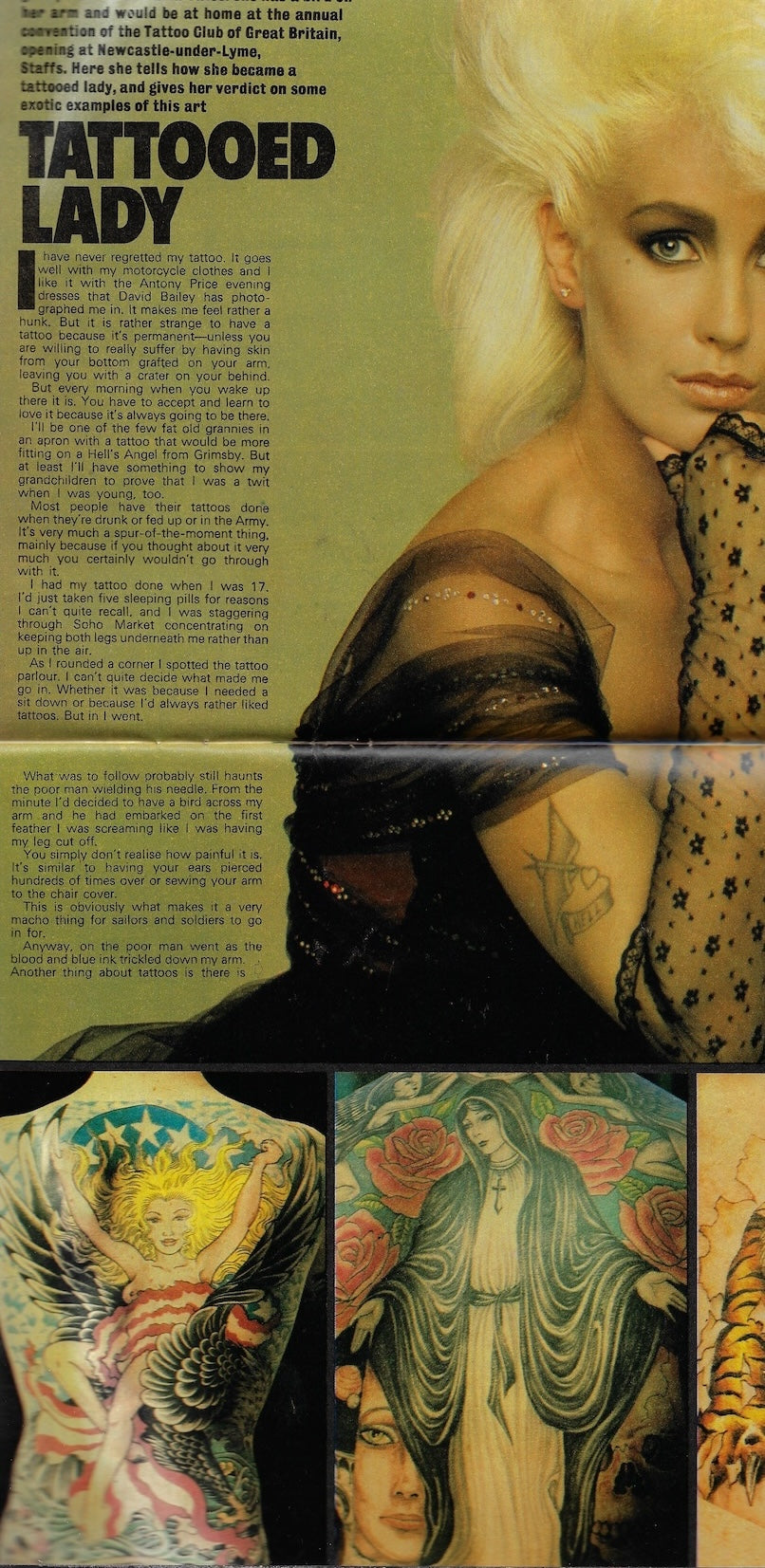 Tattooed Lady - A 2-page report on tattoos. Includes a One and a half page image of Paula Yates by David Bailey.