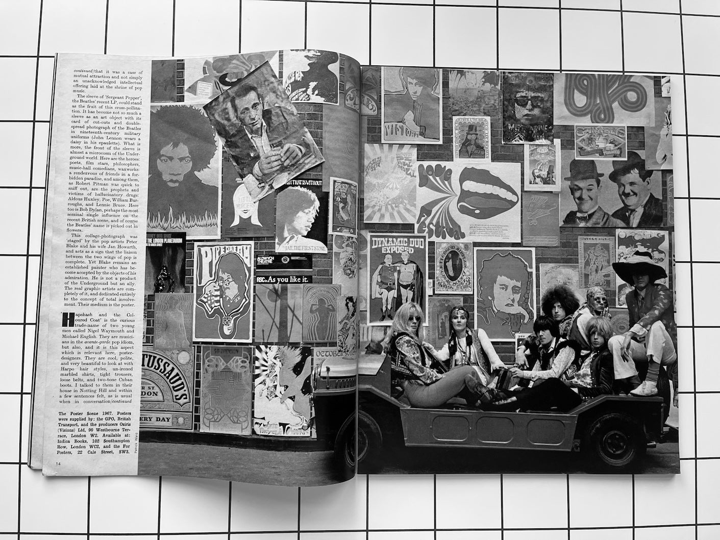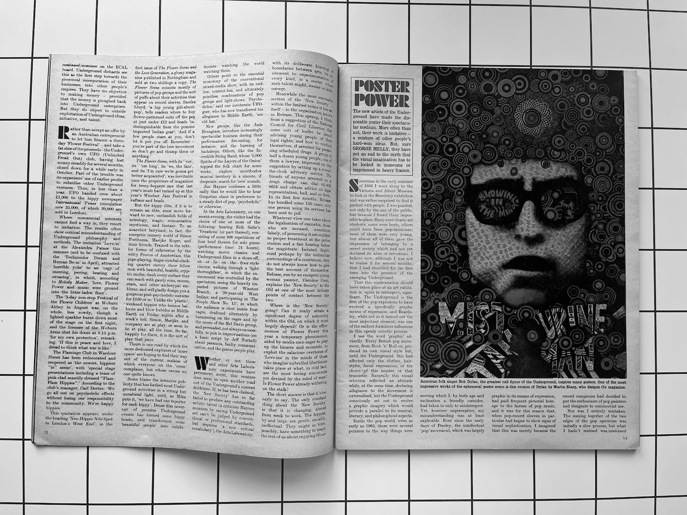 A feature on Flower Power includes an illustration of Bob Dylan by Martin Sharpe. A version of this was used for a cover of Oz Magazine.