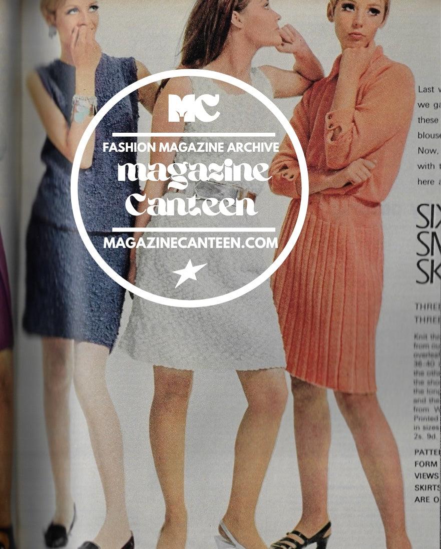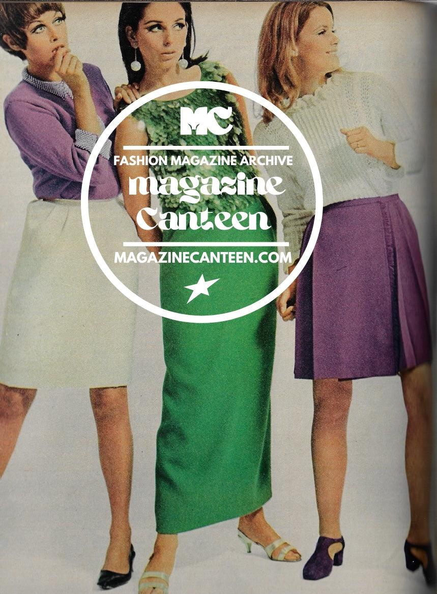 Six smart skirts - 2 pages of fashion with 6 standing models. We are quite sure Twiggy is one of the models, with her hand over her mouth