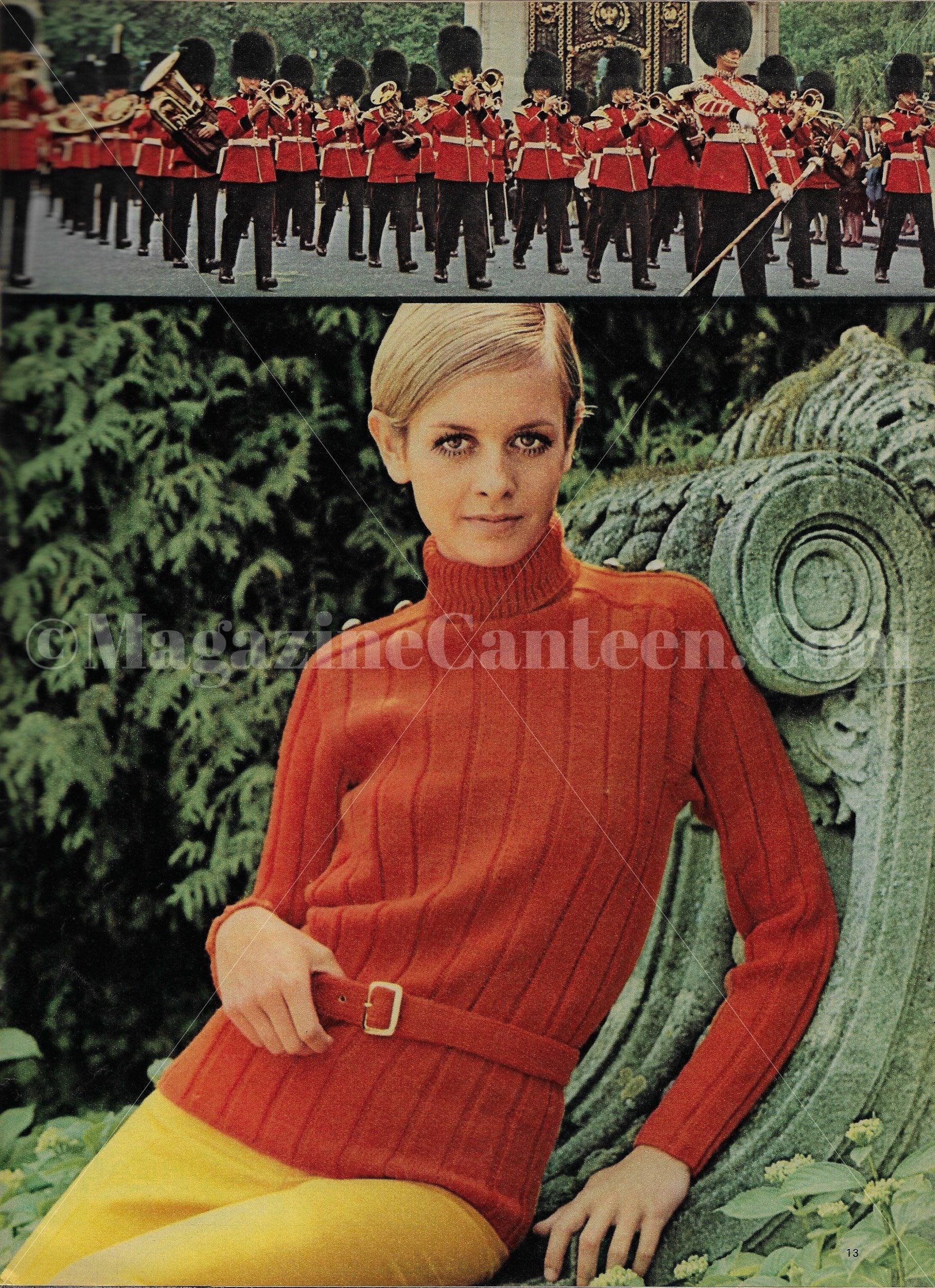 The military look - Knitting page includes 1 large image of Twiggy in a red belted jumper with yellow skirt