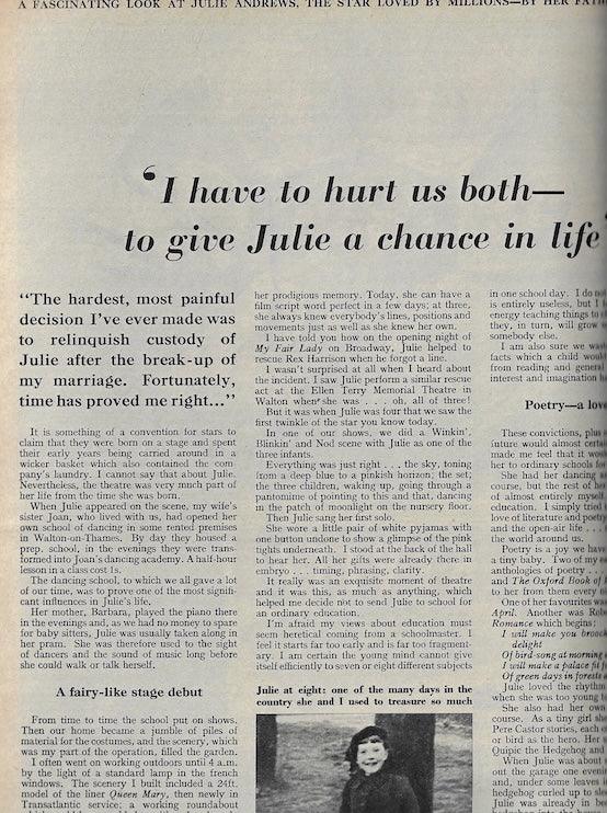 I have to hurt us both to give Julie a chance at life - One more part in the story of Julie Andrews by her father Ted Wells. Includes a full-page image of Julie Andrews on the beach holding Emma in the air.